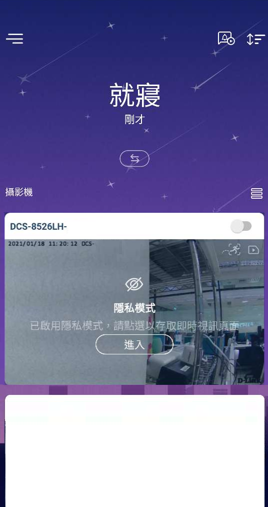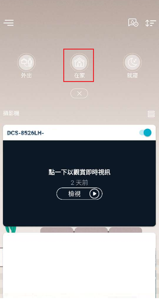 3. 在首頁上方 點選 就寢,在就寢情境中,攝影機進入隱私模式,自動化畫面顯示自動化1、自動化2皆關閉。