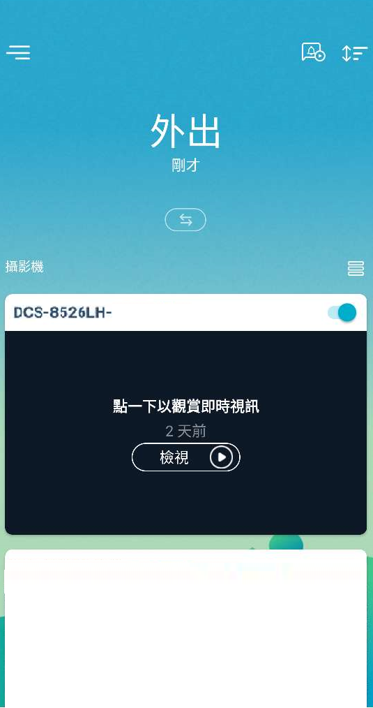 2. 在首頁上方 點選 外出,在外出情境中,自動化畫面顯示自動化1開啟(偵測到移動觸發錄影加通知),自動化2關閉(偵測到移動觸發錄影)。