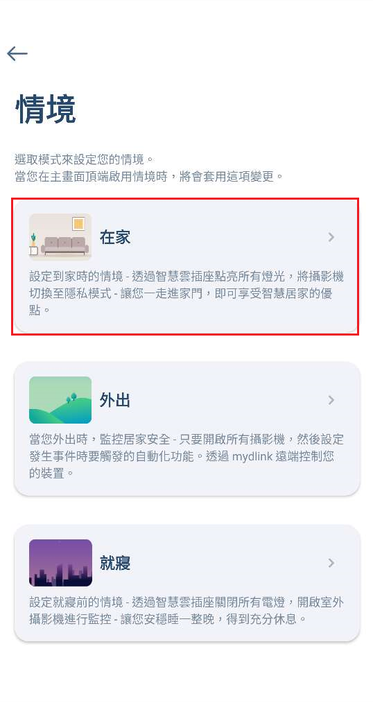 新版 mydlink 2.0 App 如何設定情境套用在不同條件的自動化和隱私模式。