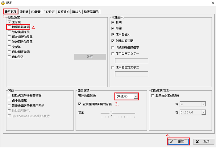 7.. 在基本設定,去打勾"排程錄影系統"在在聲音瀏覽選到您指定的攝影機,最後按確定就完成。