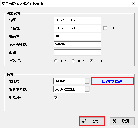 點擊 自動偵測型號 或 用下拉選單選擇您的IP cam, 建議用自動偵測型號