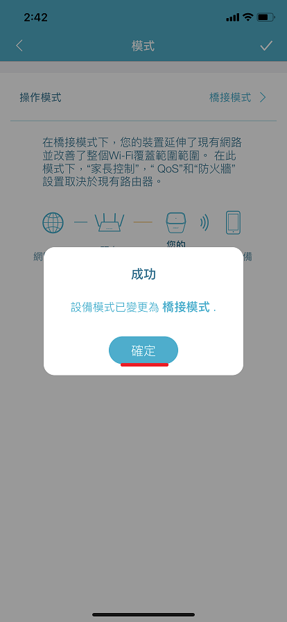 3、已變更設定為橋接模式,按下【確定】。