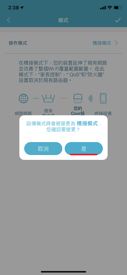 2、將操作模式切換為【橋接模式】,再點右上角✔。