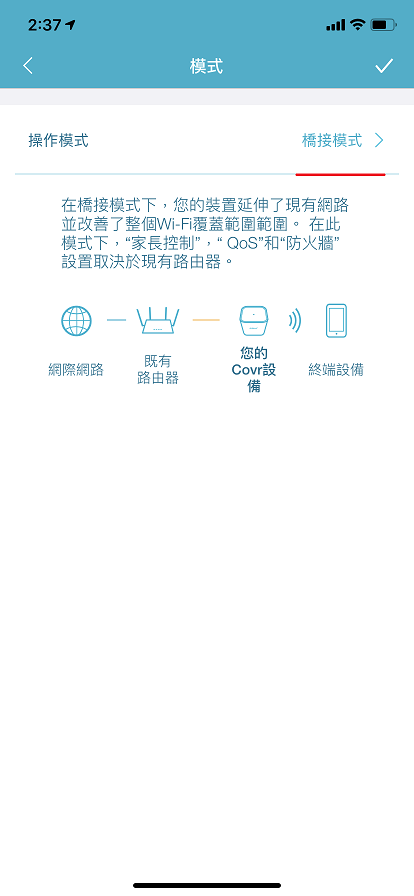 COVR-1100 支援橋接模式,您可在完成主要的COVR 設定後,變更操作模式為: 橋接模式 (Bridge mode / AP mode),並連接在既有的無線分享器上使用。