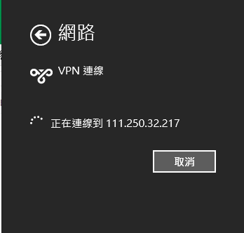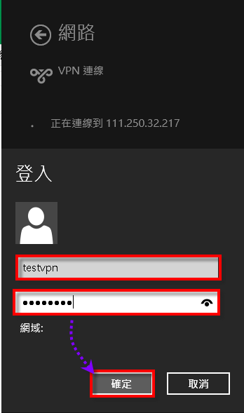 13.輸入在上列步驟2 抄起來的使用者名稱:testvpn與密碼:12345678,