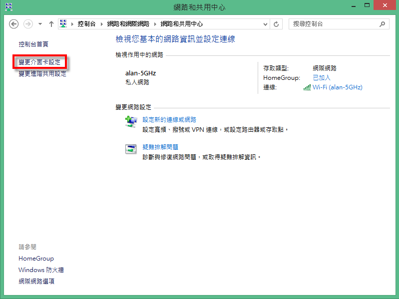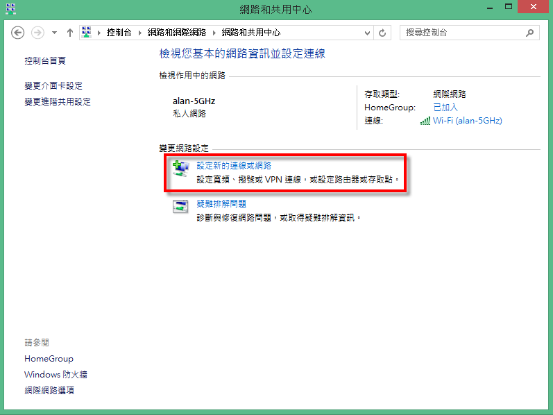 2. 網路和共用中心內,點選「設定新的連線或網路」