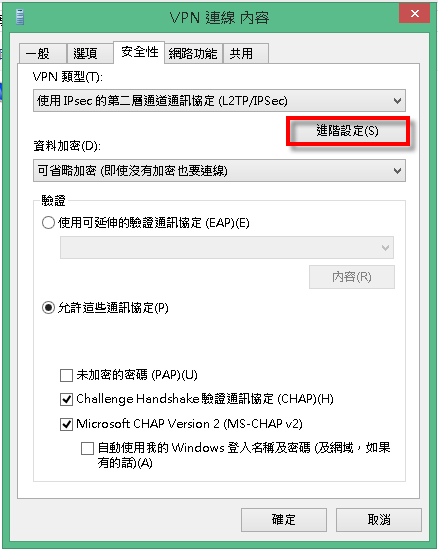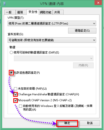 → 勾選「Microsoft CHAP Version2(Ms-CHAP v2)」→「確定」