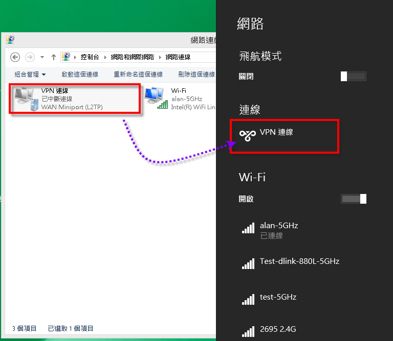 透過WIN8.1電腦連線到在DIR-880L上架設好的Quick VPN,此為L2TP over IPSec的連線方式,