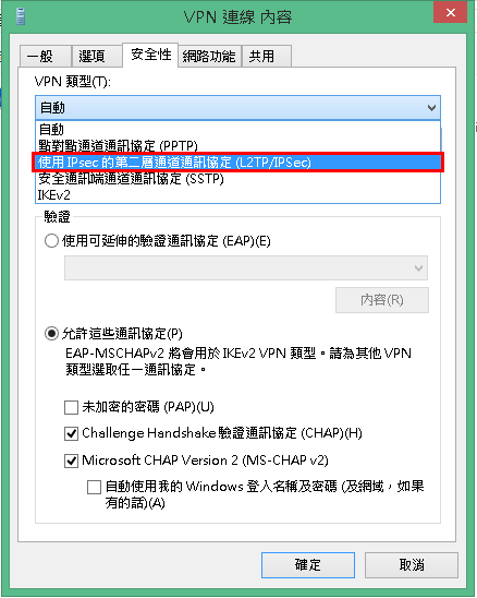 8.將「自動」修改成「使用IPsec的第二層通道通訊協定(L2TP/IPsec)」