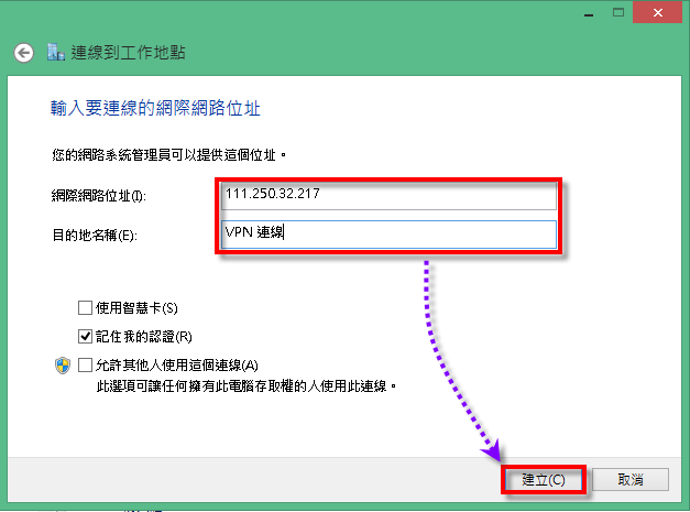 → 自訂目的地名稱「此示範為輸入VPN連線」→「建立」