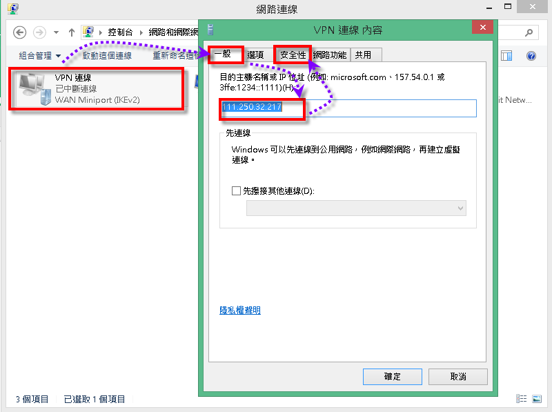 7.點選剛建立好的VPN連線,點選「一般」→「輸入真實IP位址」→「安全性」