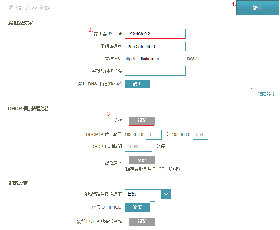 (2) 關閉 DHCP 伺服器: 請將「DHCP伺服器設定」中狀態改為關閉,讓 DIR-859 不會執行派發IP位址的功能,最後按下上方儲存。