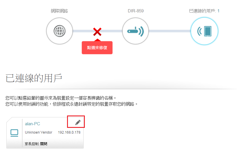 3. 可透由已連線的用戶清單中找到連上路由器的設備,在該設備顯示的右上方會有編輯圖示如下圖中紅色框框所示。