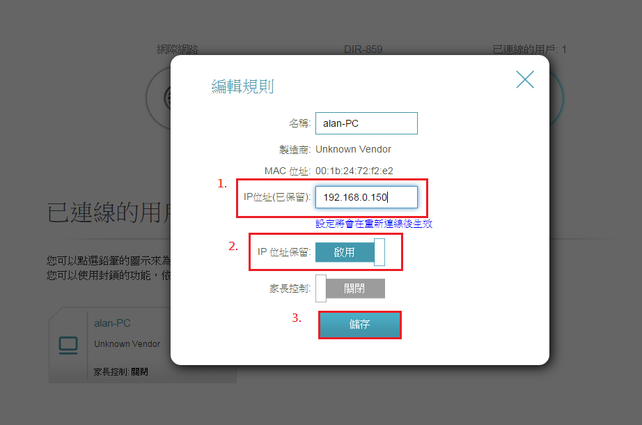 4. 於[編輯規則]中的[IP位址(已保留)]輸入預保留的IP位址,在[IP位址保留]選點選[啟用]後按下[儲存]即設定完成。