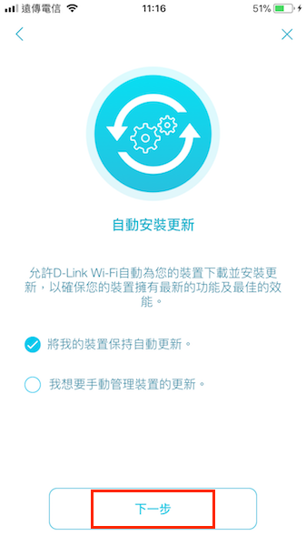 11.此步驟可自行選擇是否讓COVR自動安裝更新程式,若無需自動更新,可選擇『我想要手動管理裝置更新』→『下一步』