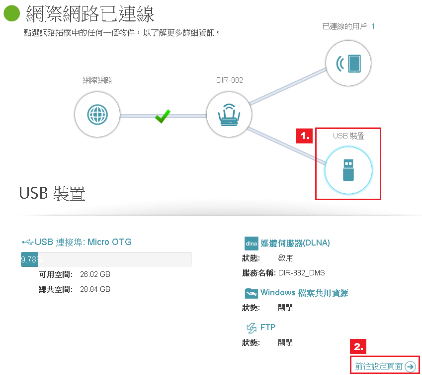 步驟一:點選 首頁 > 1. USB裝置 > 2. 前往設定頁面。
