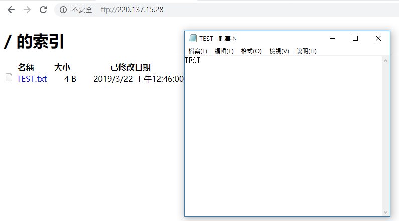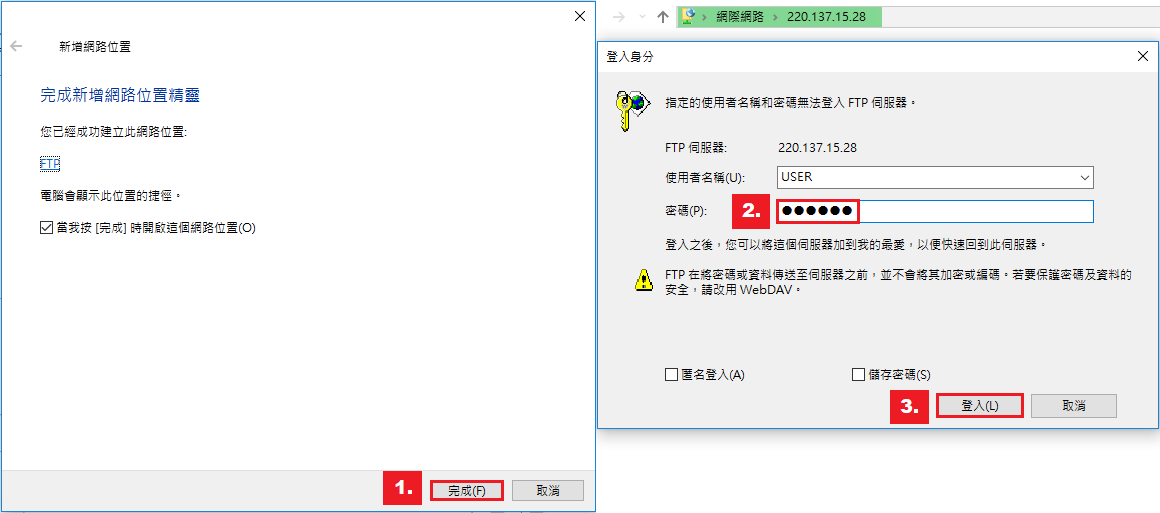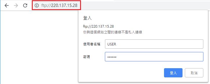 步驟一:打開網頁在網址欄位輸入查詢到的IP位置[ ftp://220.137.15.28],會跳出登入畫面,