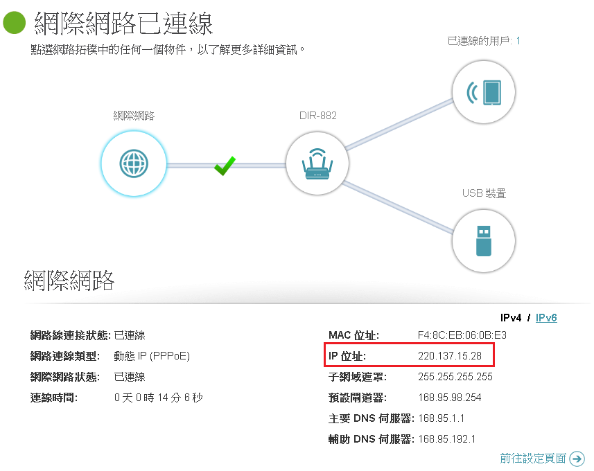 確認首頁的IP位址是否為實體IP,對外上網IP位址需為實體 IP(Public IP),遠端存取FTP才可使用,