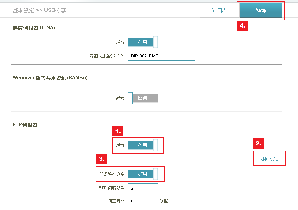 步驟二:在FTP伺服器欄位點選 1.狀態啟用 > 2.進階設定 > 3.開啟遠端分享啟用 > 4.儲存。