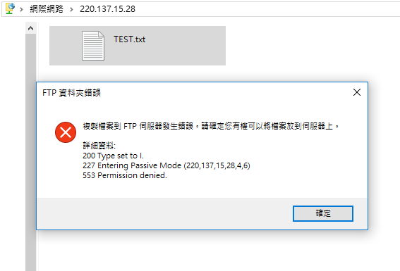 步驟五:因USER使用者權限設定唯讀,故將其他檔案丟至FTP伺服器裡則會出現錯誤訊息。