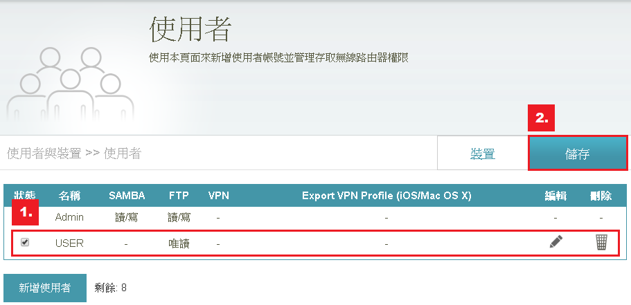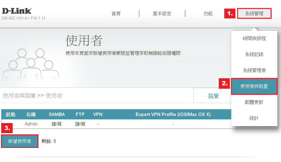 步驟三:點選 1.系統管理 > 2.使用者與裝置> 3.新增使用者。