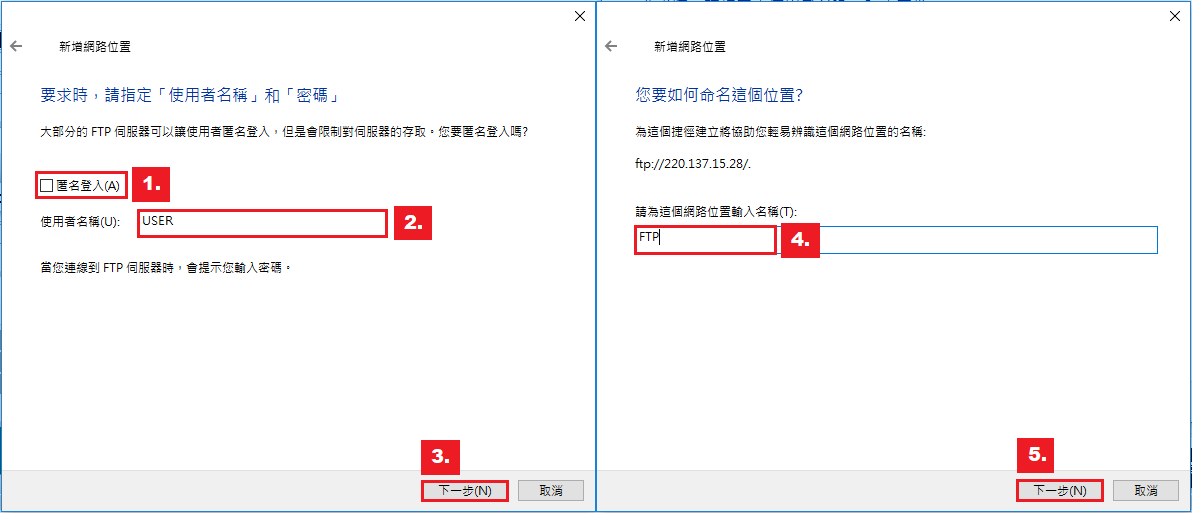 步驟三:1. 取消勾選匿名登入 >2. 使用者名稱輸入 [USER] > 3. 下一步 > 4.自訂名稱 [FTP] > 5. 下一步。