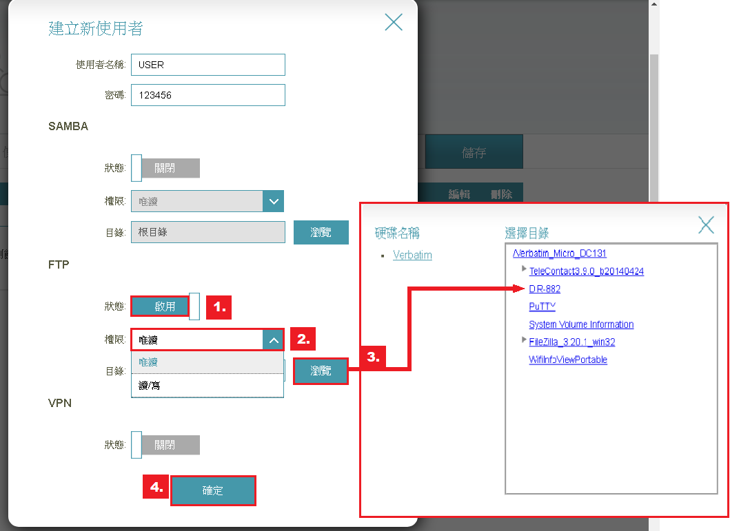 步驟四:在FTP欄位點選 1.狀態啟用 > 2. 權限唯讀 > 3.瀏覽跳出視窗選擇資料夾[DIR-882]> 4. 確定。