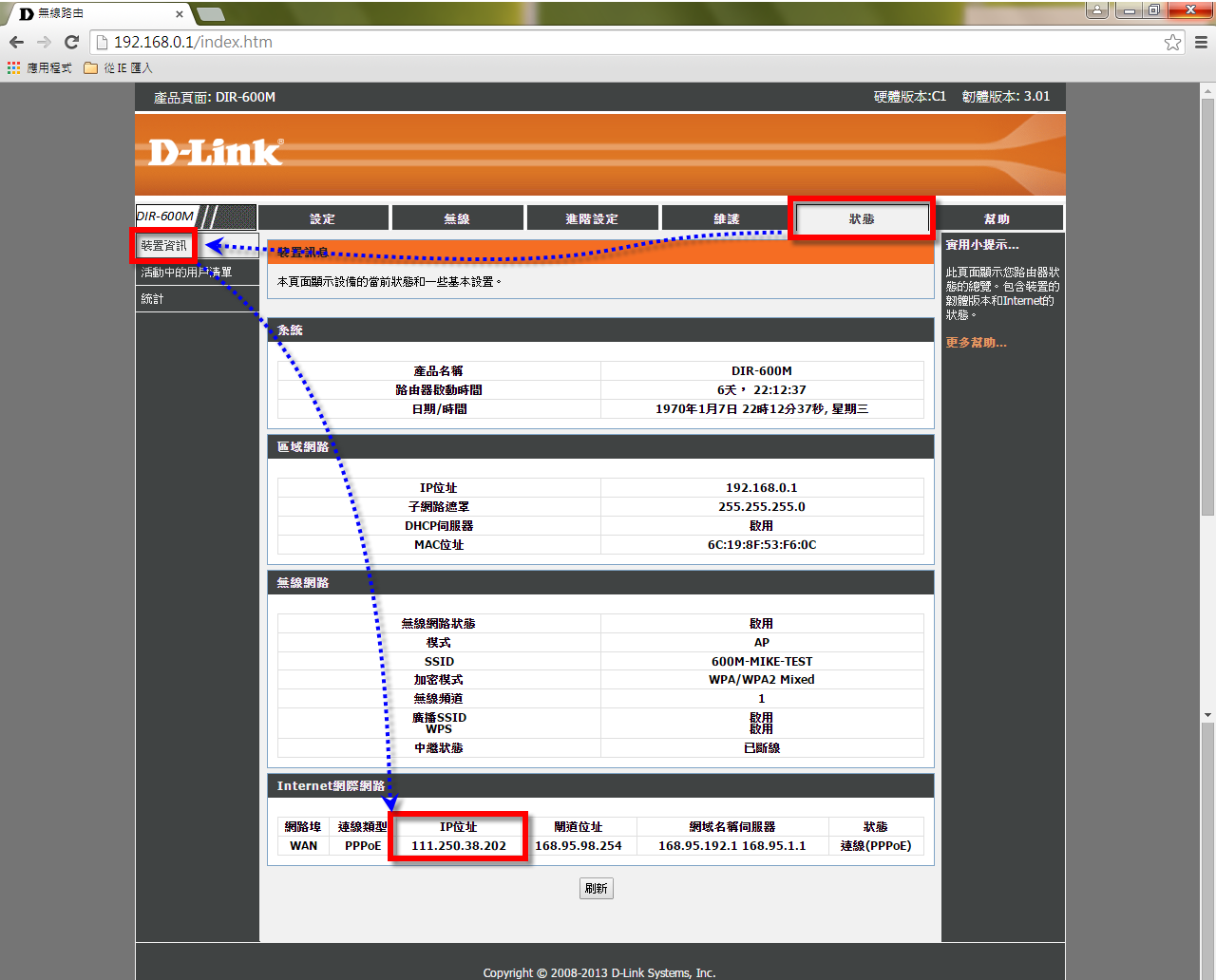 步驟三 : 點選「狀態」→「裝置資訊」→「記下此真實浮動IP位址」