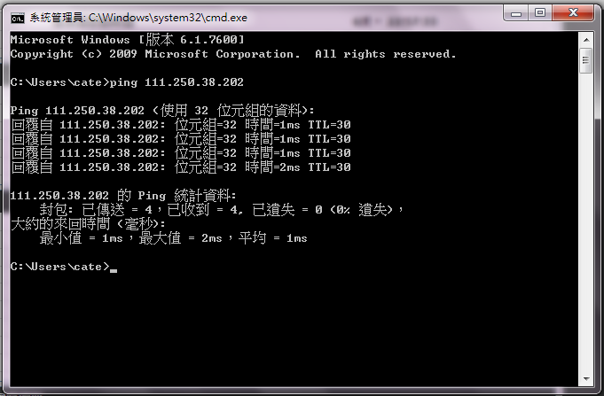 在命令提示字元內輸入指令ping 111.250.38.202(剛記下的真實浮動IP位址),即可收到封包回傳的回應訊息