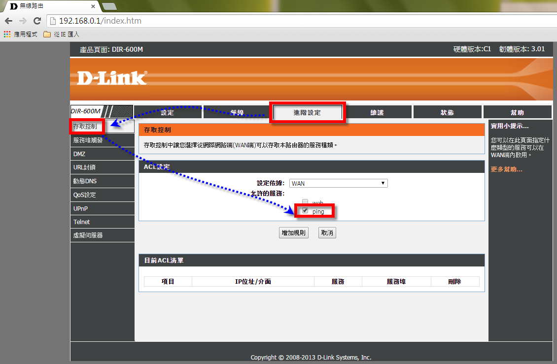 步驟二 : 點選「進階設定」→「存取控制」→ 勾選 PING →「儲存設定」