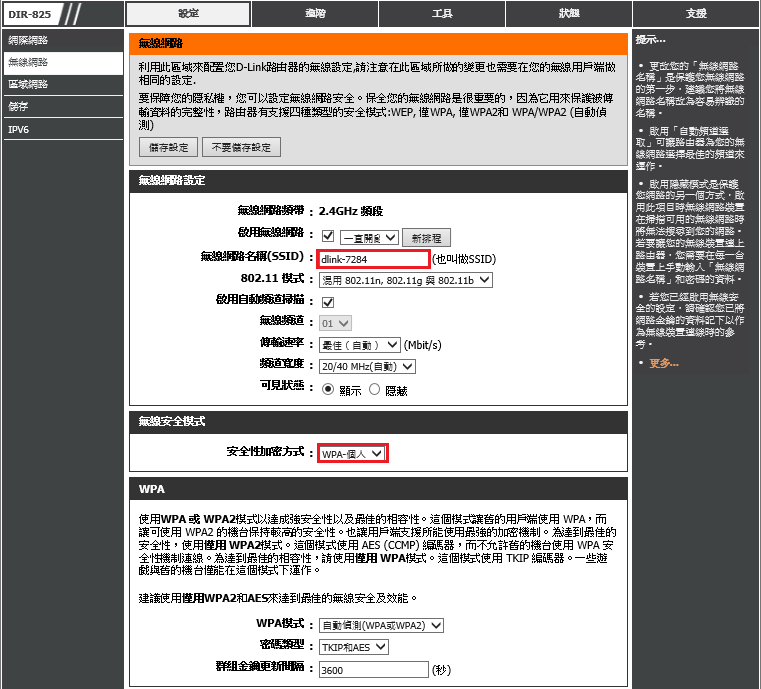 路由器型號:DIR-825,硬體版本:G,韌體版本:7.00