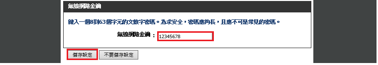 預先共用金鑰:請輸入您自己所設定的無線密碼(8-63字元『0-9 a-z』)