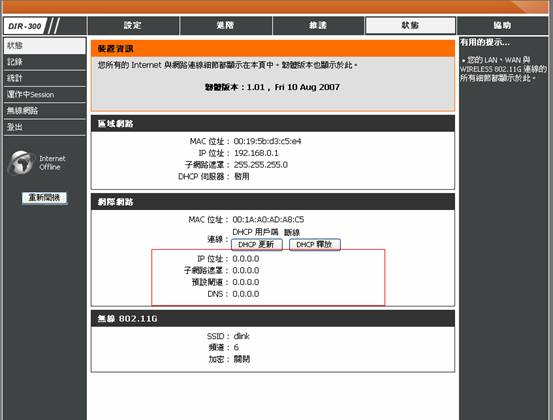 若無取得IP位址請點選「DHCP更新」稍後顯示IP位址,已可對外連線上網了。