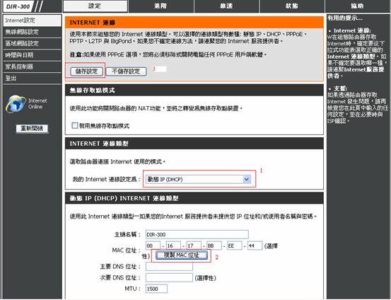 3. 我的網際網路連線類型為:請選擇 【動態IP (DHCP)】,點選【複製電腦的MAC位址】,