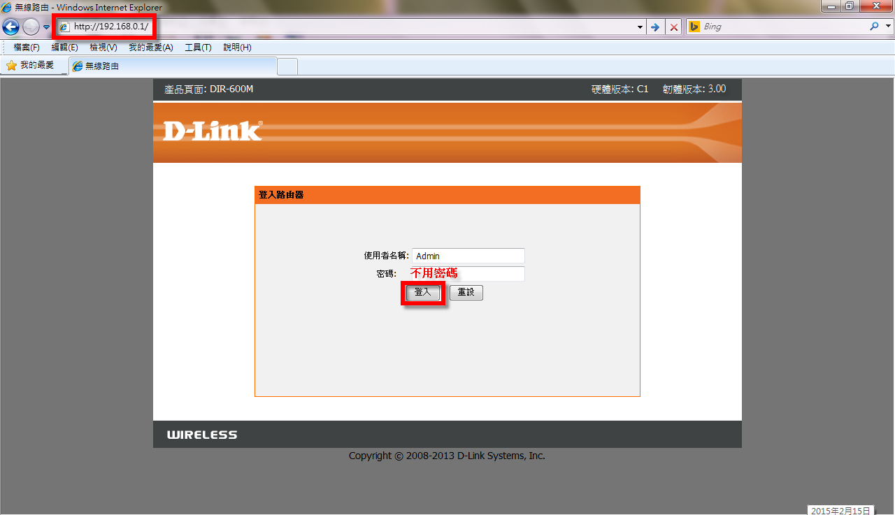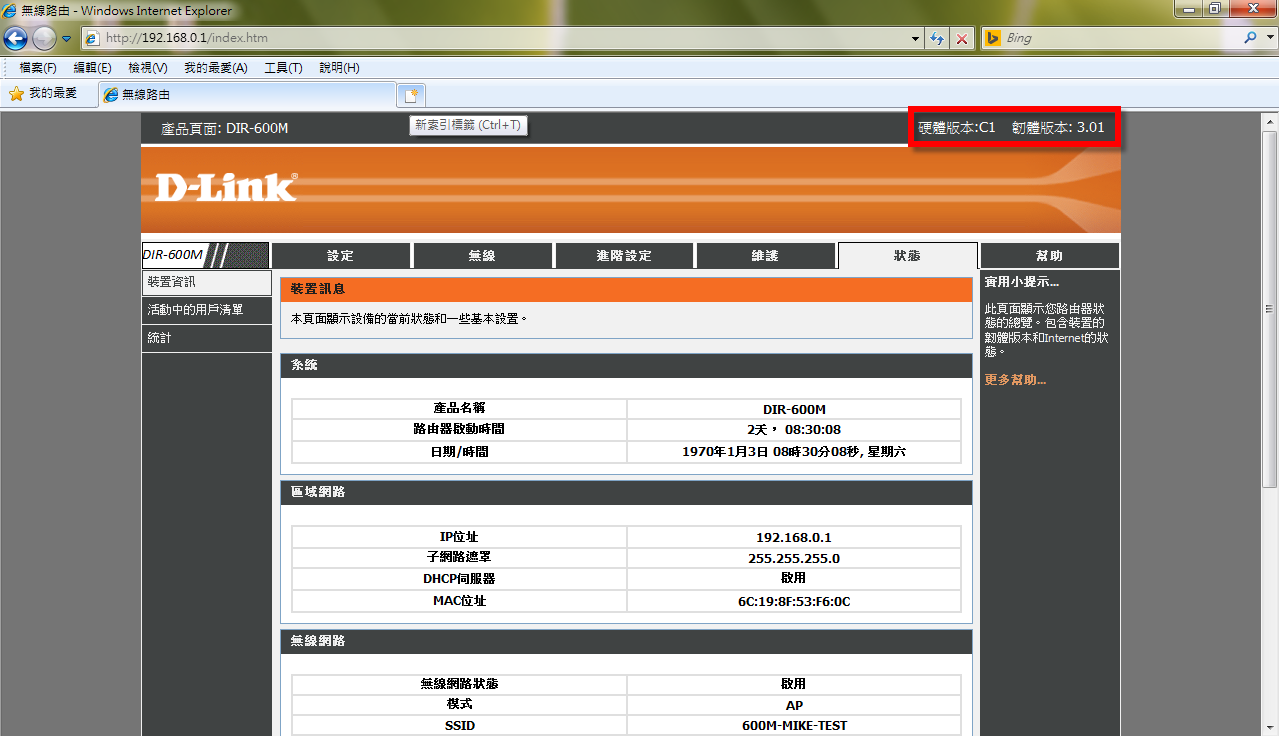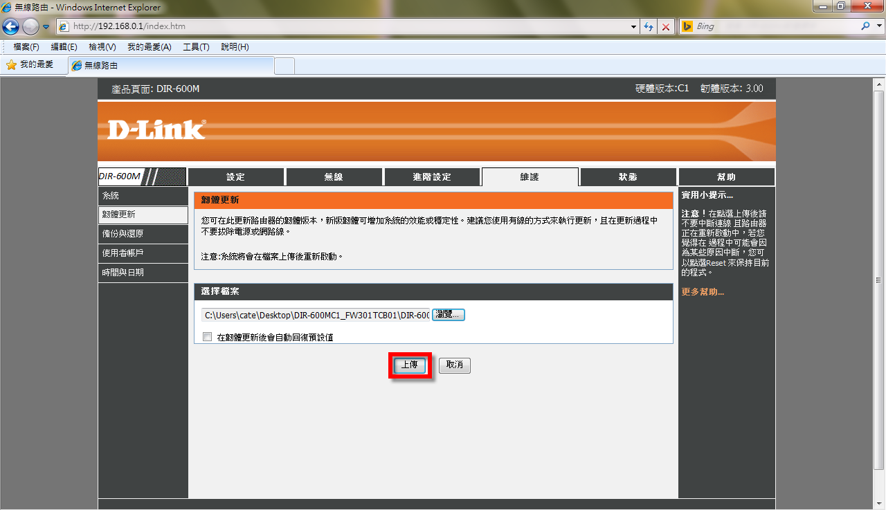 路由器型號:DIR-600M,硬體版本:C1,韌體版本:3.00