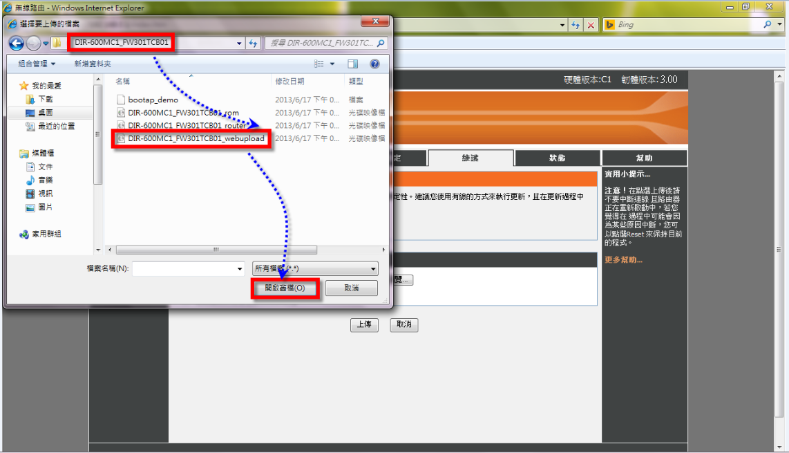 至電腦桌面找尋下載好的並已解壓縮的資料夾(名稱:DIR-600MC1_FW301TCB01)→