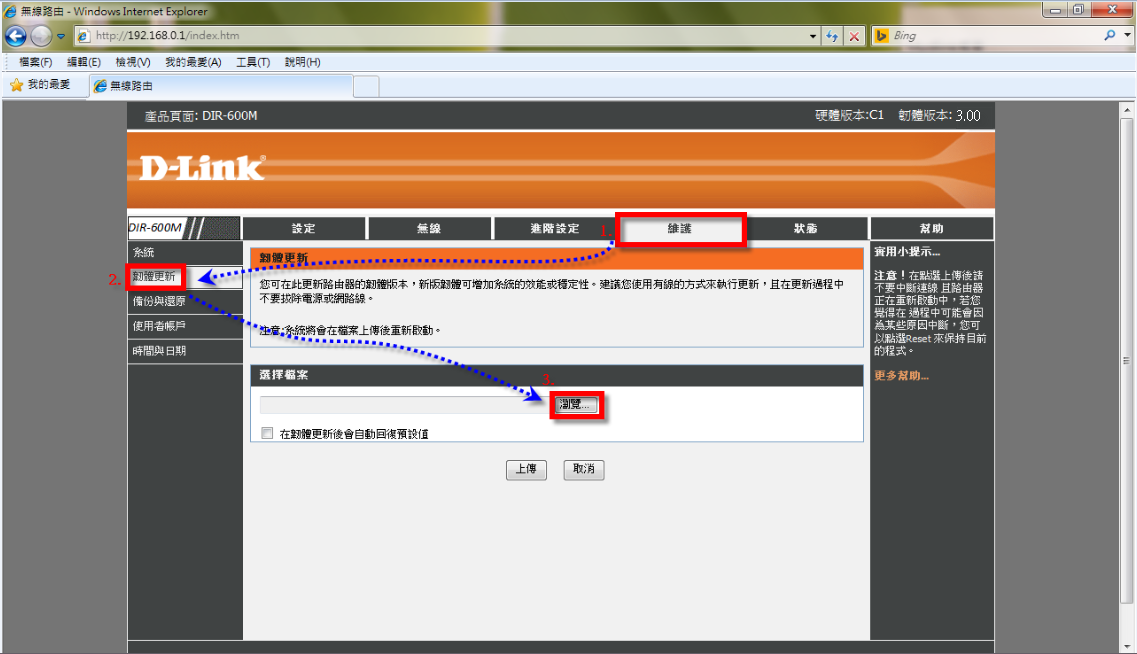 步驟四 : 點選「維護」→選左邊「韌體更新」→按下「瀏覽」