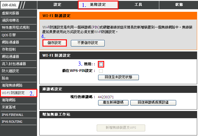 6. 點選「進階設定」à「WI-FI 防護設定」à「取消啟用勾選」à「儲存設定」