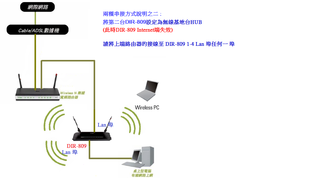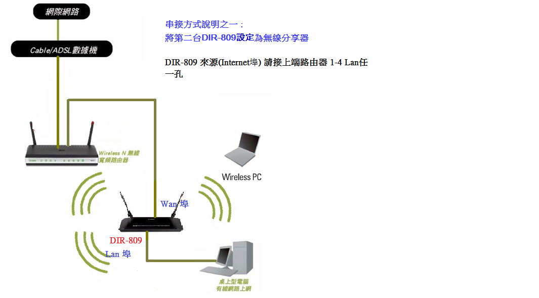 若您目前已有IP分享器的設備,又新購一台DIR-809,兩台IP分享器想要串接一起使用時,您可使用以下方式串接。將第二台DIR-809 當作無線分享器使用。