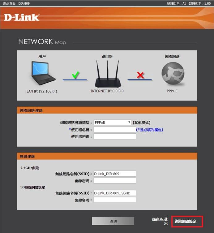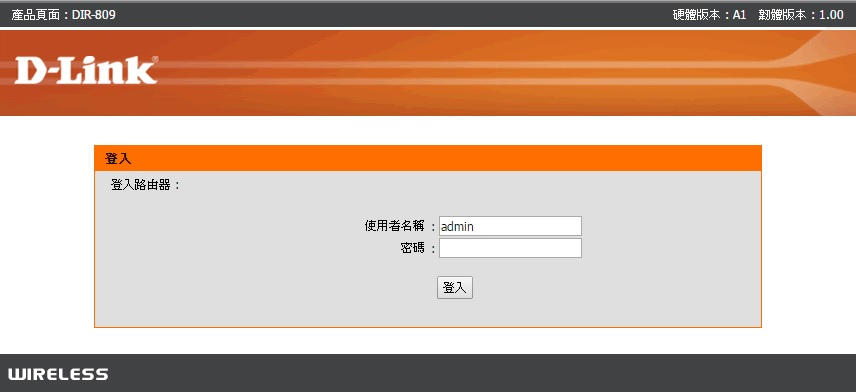 打開網頁瀏覽器,網址列輸入「192.168.0.1」按enter 後,出現設備登入畫面,我們到DIR-809