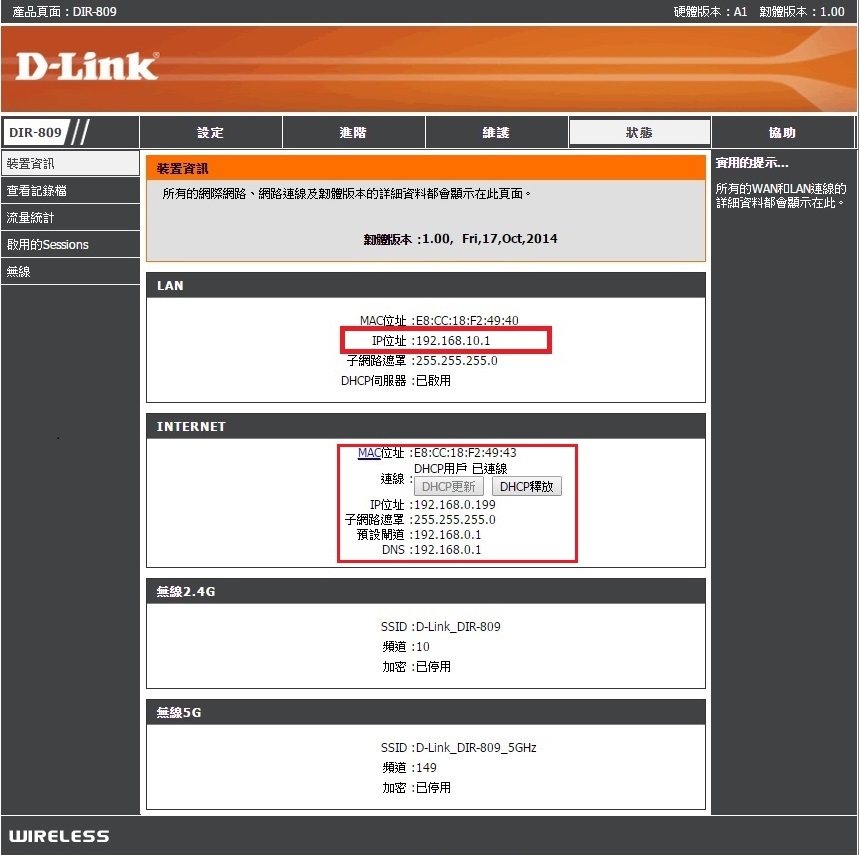 7、再回到已更改設定完畢的 DIR-809 分享器管理頁面 ( IP位址已變更為 192.168.10.1) 的【狀態】頁面,您可看到 DIR-809 分享器IP位址已變更。