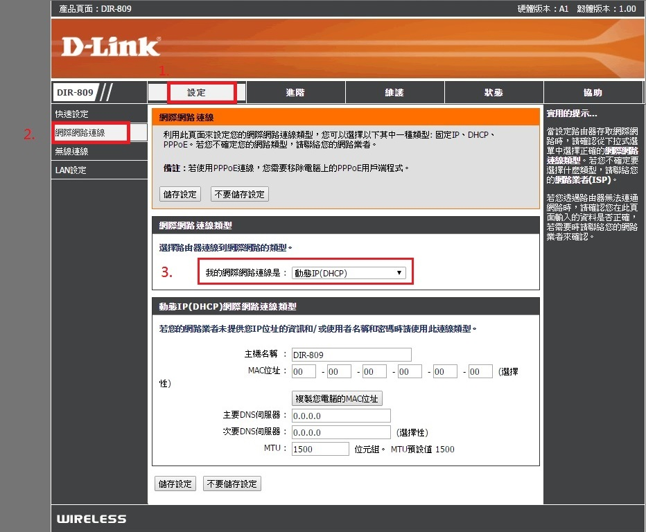 4. 點選設定à 網際網路連線à 確認網際網路連線方式是DHCP動態IP (DHCP)