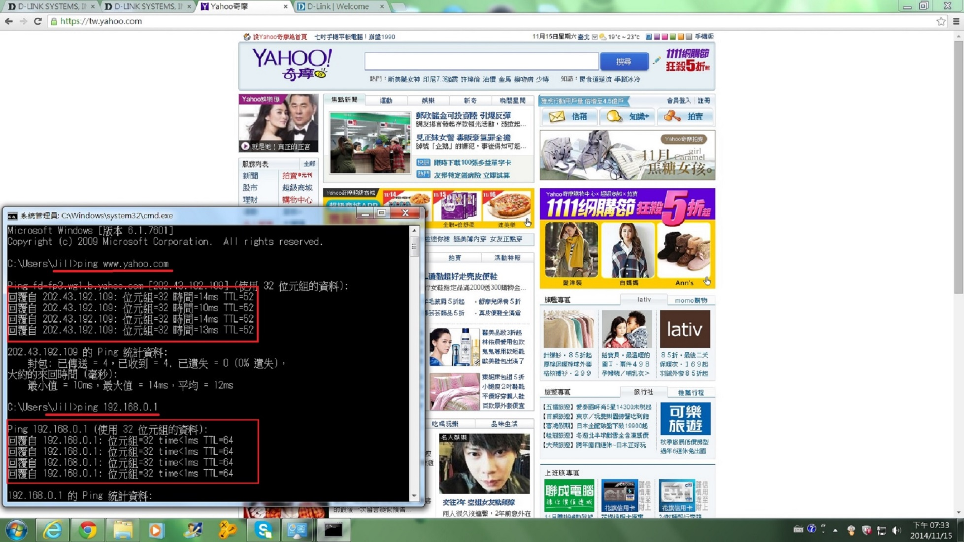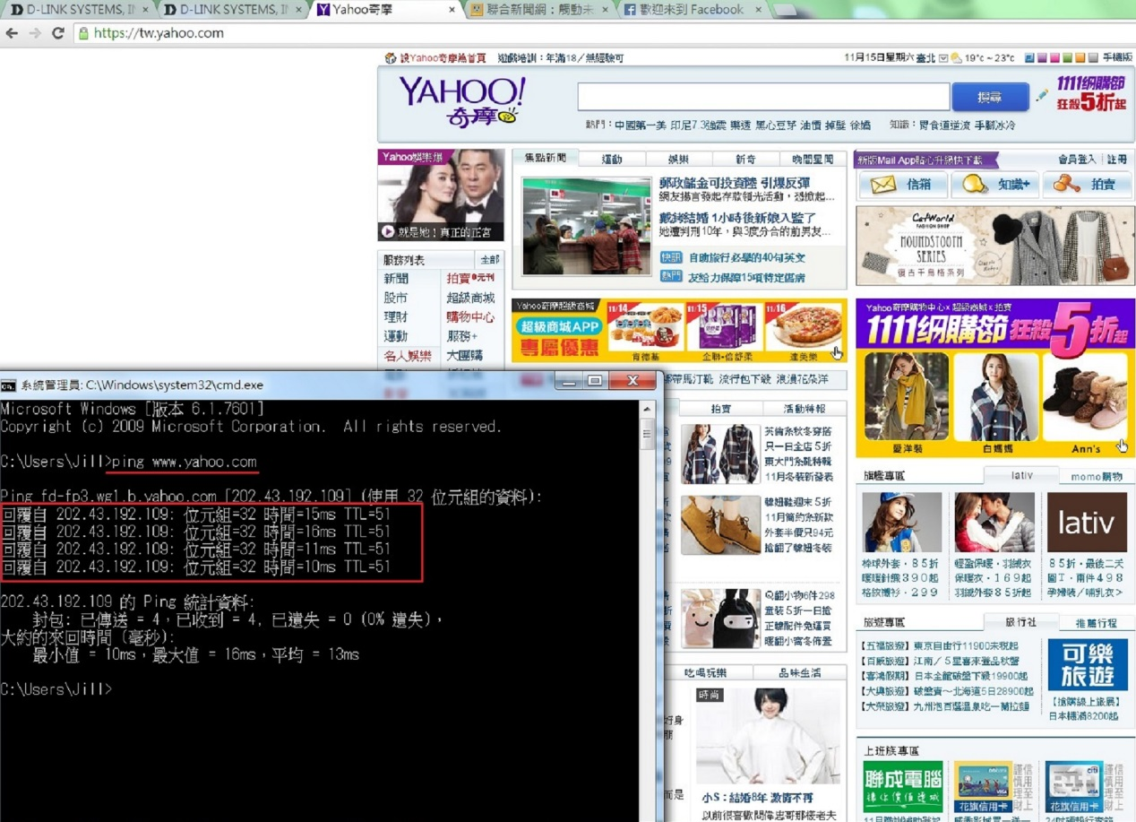 5. 開啟一網頁或嘗試 PING對外網站,可以PING到且有回應,設定即成功。此時您可用任一無線或有線電腦連上DIR-809 ,即可對外做連線上網動作。