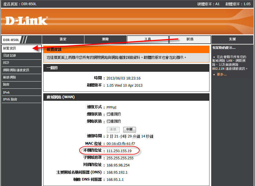 路由器型號:DIR-850L,硬體版本:A1,韌體版本:1.05