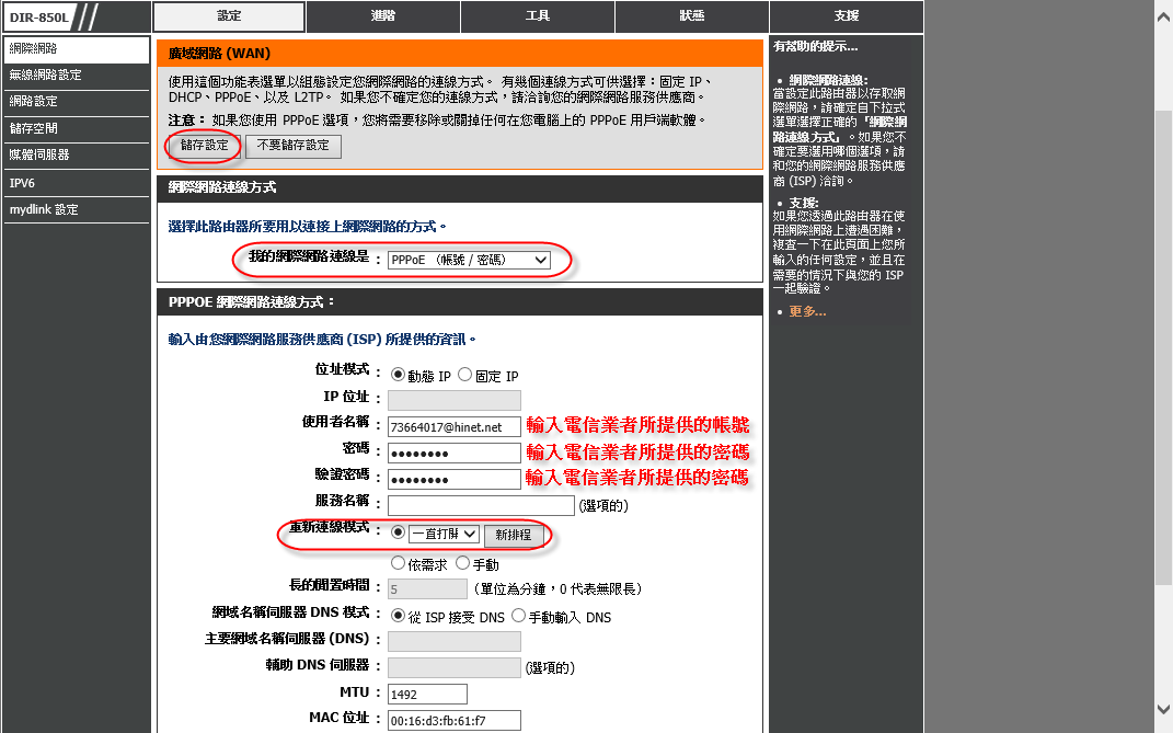 (下圖輸入資訊為設定範例),重新連線模式:「一直打開」→儲存設定