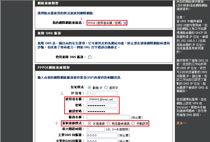 密碼:請輸入由ISP業者提供給您的PPPoE密碼。確認密碼:請再次輸入一次密碼以利驗證。