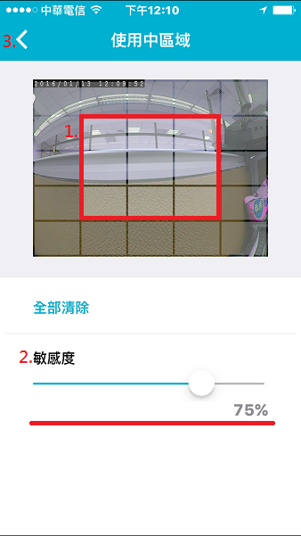 9、劃定要被移動偵測的區域範圍,並拖曳靈敏度百分比。 (注意: 設定過高的靈敏度和環境亦有光影的變化都會觸發移動偵測錄影)