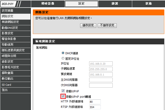2、至「設定」à「網路設定」à 將「啟動UPnP port轉遞」勾選起來,設備預設的HTTP與RTSP為80與554埠,若您想要更改則可在下方欄位中輸入您想要的數字,之後按下「儲存設定」按鈕