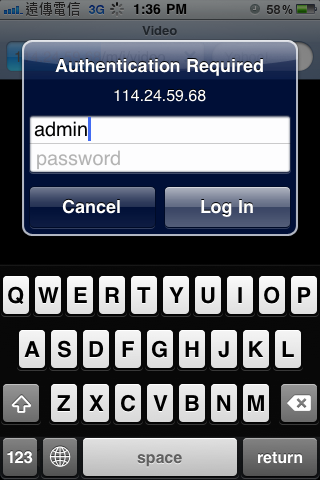 3、出現登入的驗證視窗,在上方欄位輸入攝影機的使用者名稱,下方輸入攝影機密碼,之後按下「Log In」來登入