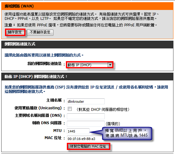 點選【複製電腦的MAC位址】,之後點選上方【儲存設定】按鈕